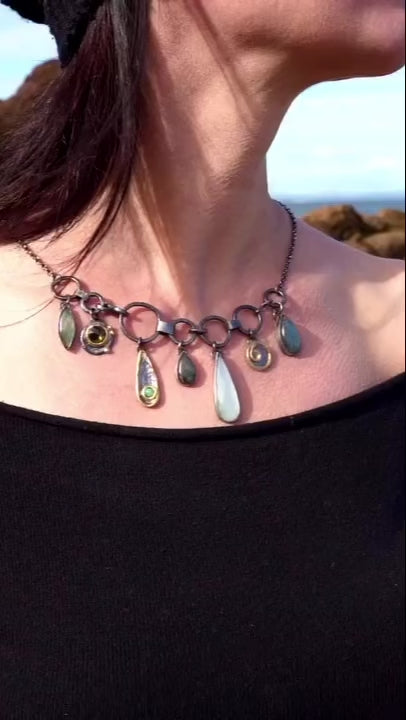 Hand‑sculpted in silver, Aurora of the Six unites labradorite, moonstone, tourmaline, and topaz in a constellation of elemental energies. A talisman for the woman who walks her path with intention, it glows with transformation, intuition, clarity, and heart. A sovereign statement for the contemporary bohemian goddess.