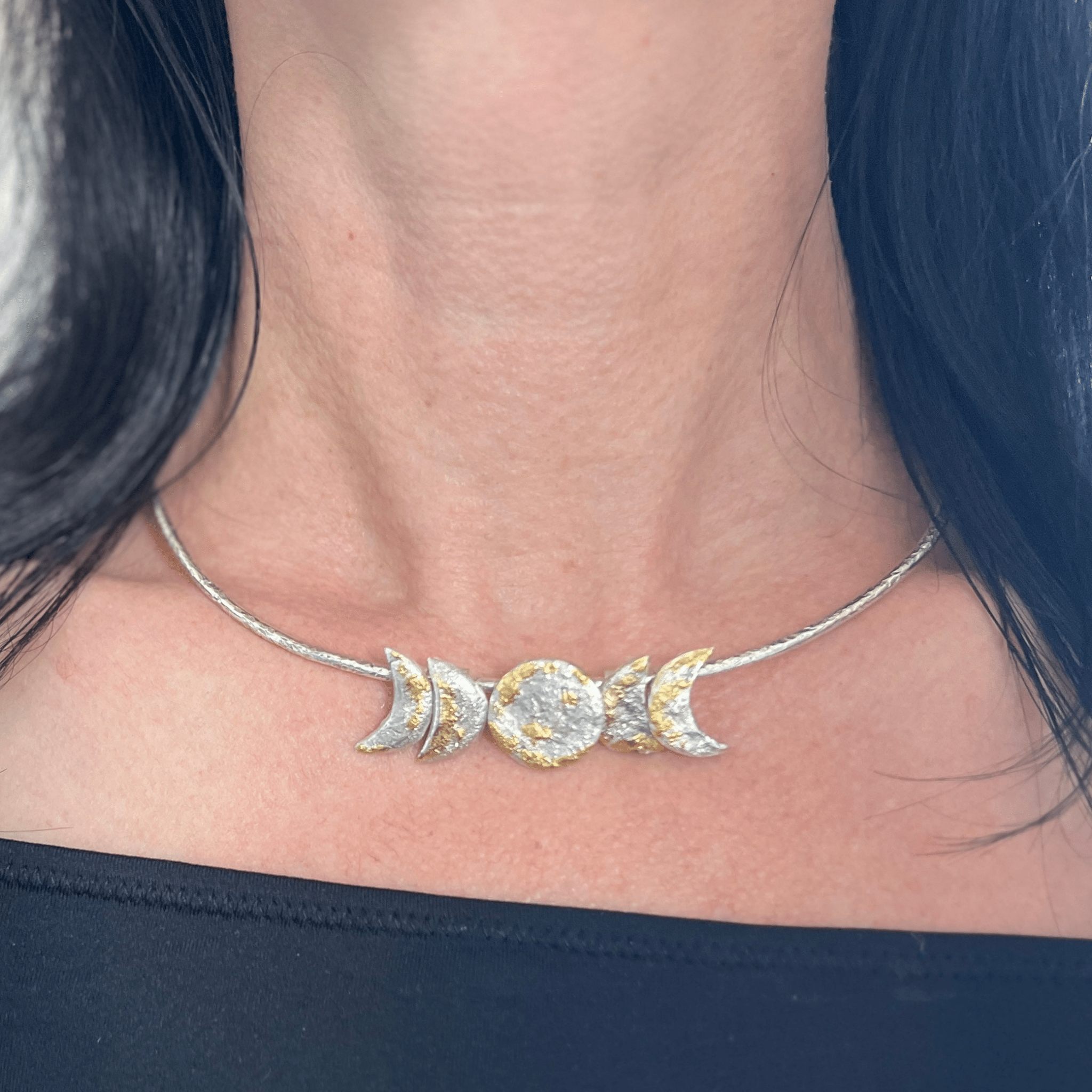Honouring the eternal rhythm of the lunar cycles, the Moon Phases Choker Necklace is a sculptural tribute to feminine transformation and inner power. Each phase of the moon — from new to full — has been hand-sculpted in pure silver, carefully fired to preserve its organic texture, and adorned with delicate 24ct gold accents. The result is a shimmering dance of light and shadow, echoing the ever-changing yet constant presence of the moon.