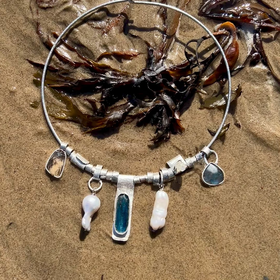 Like a talisman born of moonlit waters and ancient earth, Whispering Tides carries the voice of the elements and the wisdom of the goddess. Hand‑crafted in sterling silver, this 15‑inch choker is a constellation of rare and radiant treasures — each chosen for its spirit, beauty, and power.